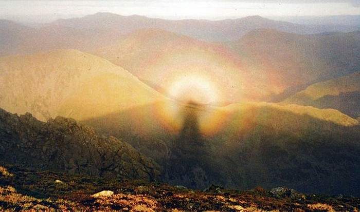 Когато времето е мъгливо, можете да видите интересен оптичен феномен – т. нар. „Пречупен спектър.“ За да направите това, просто обърнете гръб към основният източник на светлина в мъгливо време. Наблюдателят ще види собствената си сянка да лежи върху мъглата (или над облаците, ако сте в планински район).