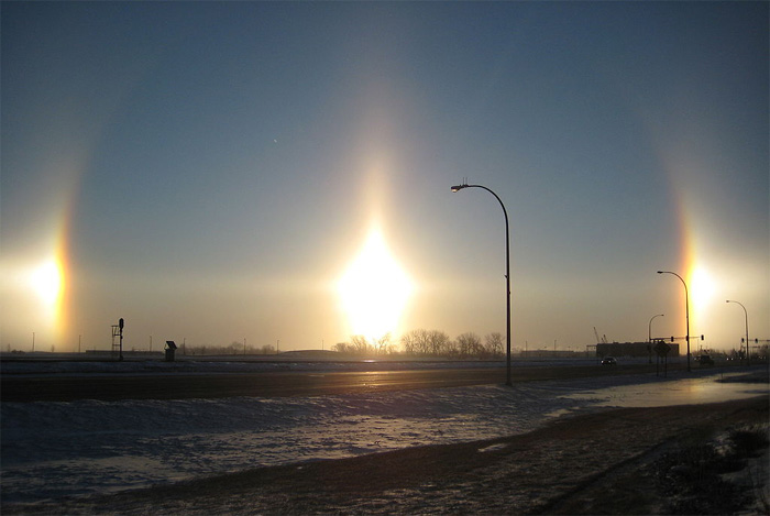 Когато слънцето е на най-ниската надморска височина, над хоризонта, и в атмосферата се образуват микроскопични ледени кристали. Наблюдателите на този феномен могат да забележат няколко точици светлина, нажежени от двете страни на слънцето. Ефектът се наблюдава най-добре в ранните сутрешни часове или късно вечерта в полярните региони.